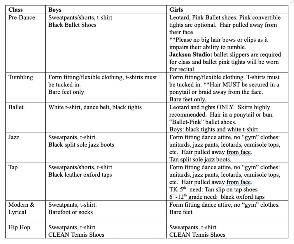 If a student comes to class not dressed accordingly, he/she will receive a warning. If it happens a second time, he/she will have to sit the class out and you will be notified. Thank you so much for complying with these policies – correct attire is critical to the atmosphere and structure of each class.